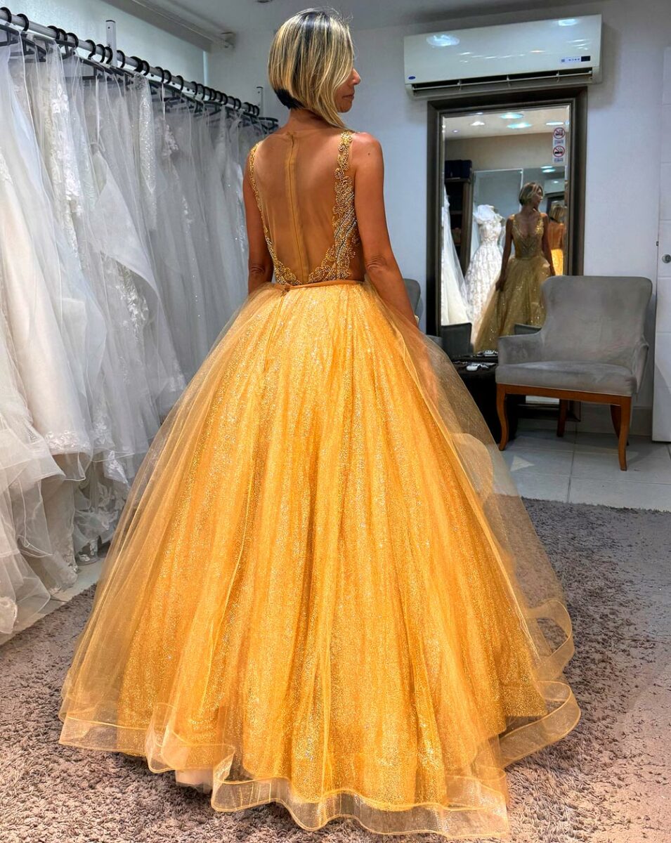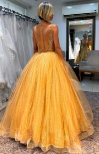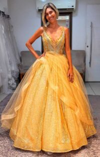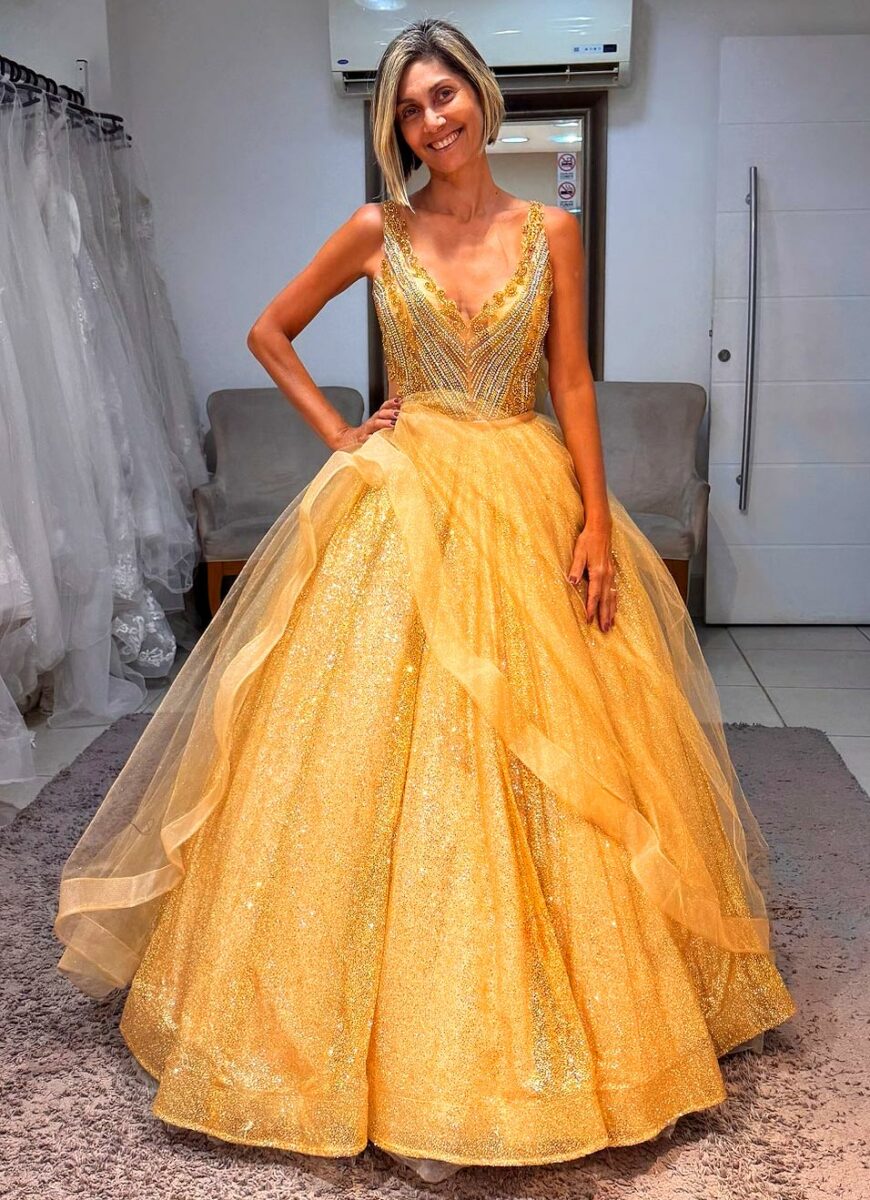 Para a cerimônia e os momentos mais formais, o macaquinho pode ser combinado com uma deslumbrante saia longa sobreposta, alugada separadamente, que transforma o look em um vestido de baile clássico. A saia, também em um tom dourado cintilante, é confeccionada em camadas de tule fino com glitter, criando um volume majestoso e um brilho sutil a cada movimento. Sua silhueta princesa começa em uma cintura marcada e se expande em uma saia cheia e esvoaçante, ideal para grandes entradas e fotos memoráveis. O detalhe de babados em tule na saia adiciona profundidade e um toque romântico.