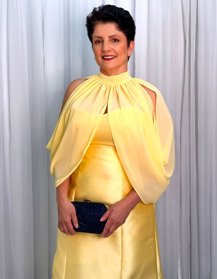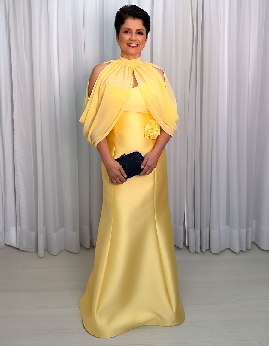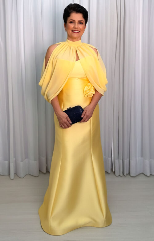 Modelo amarelo Cítrico uma tonalidade vibrante e clara com silhueta estilo sereia/Evasê justa no busto e quadril, abrindo suavemente do joelho até a barra. Confecionado em zibeline encorpado com acabamento acetinado e estruturado. Possui um acabamento superior em fortmadto de capa cola alta em musseline leve e esvoaçante (decote gola alta e decote tomara que caia na parte interna, com decote off-shoulder (ombros à mostra) devido à capa. Mangas estilo Capa/Bufante nos ombros, com fendas laterais que expõem os ombros e braços. Detalhes em aplicação de flor 3D em tecido no quadril esquerdo.