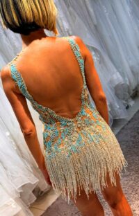 O macaquinho curto apresenta uma silhueta justa e valorizadora da forma feminina, confeccionado em base nude com intricados bordados em fios prateados e azul, que criam um efeito artístico e luminoso sobre a pele. O decote em V profundo alonga o colo e traz sofisticação, enquanto as franjas de canutilhos, pedrarias e cristais na barra adicionam movimento e brilho a cada passo. O acabamento é meticuloso, refletindo o cuidado artesanal em cada detalhe.