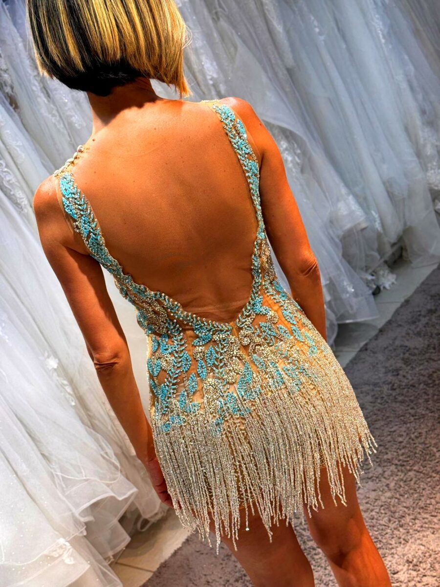 Vestido curto prata e azul justo com decote em V todo bordado em pedrarias e franjas de cristais