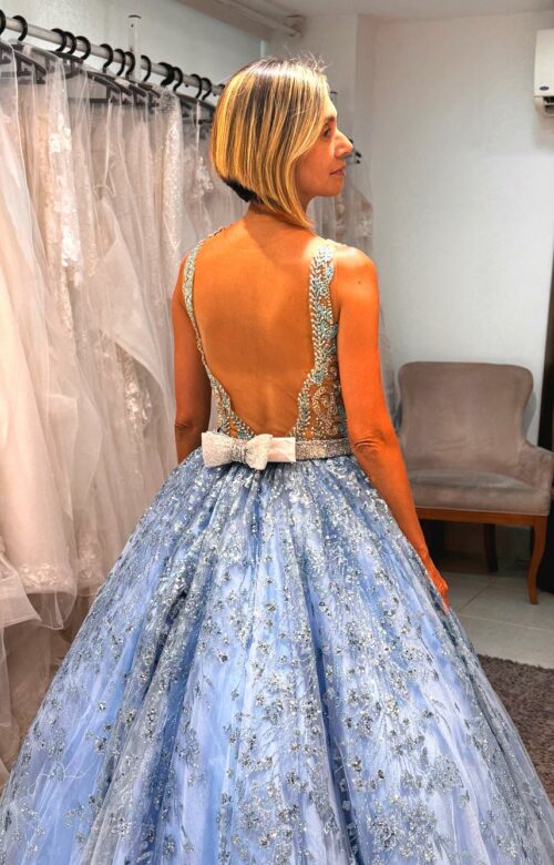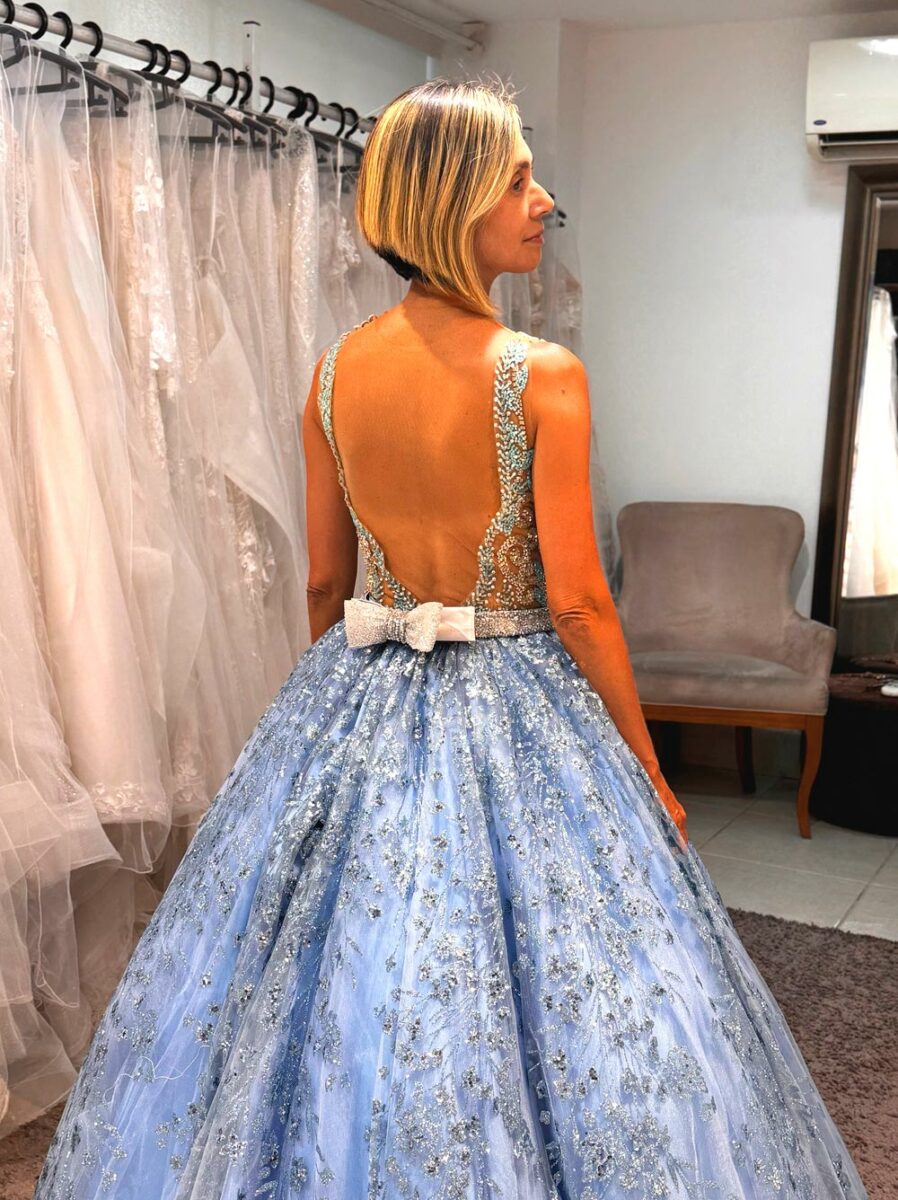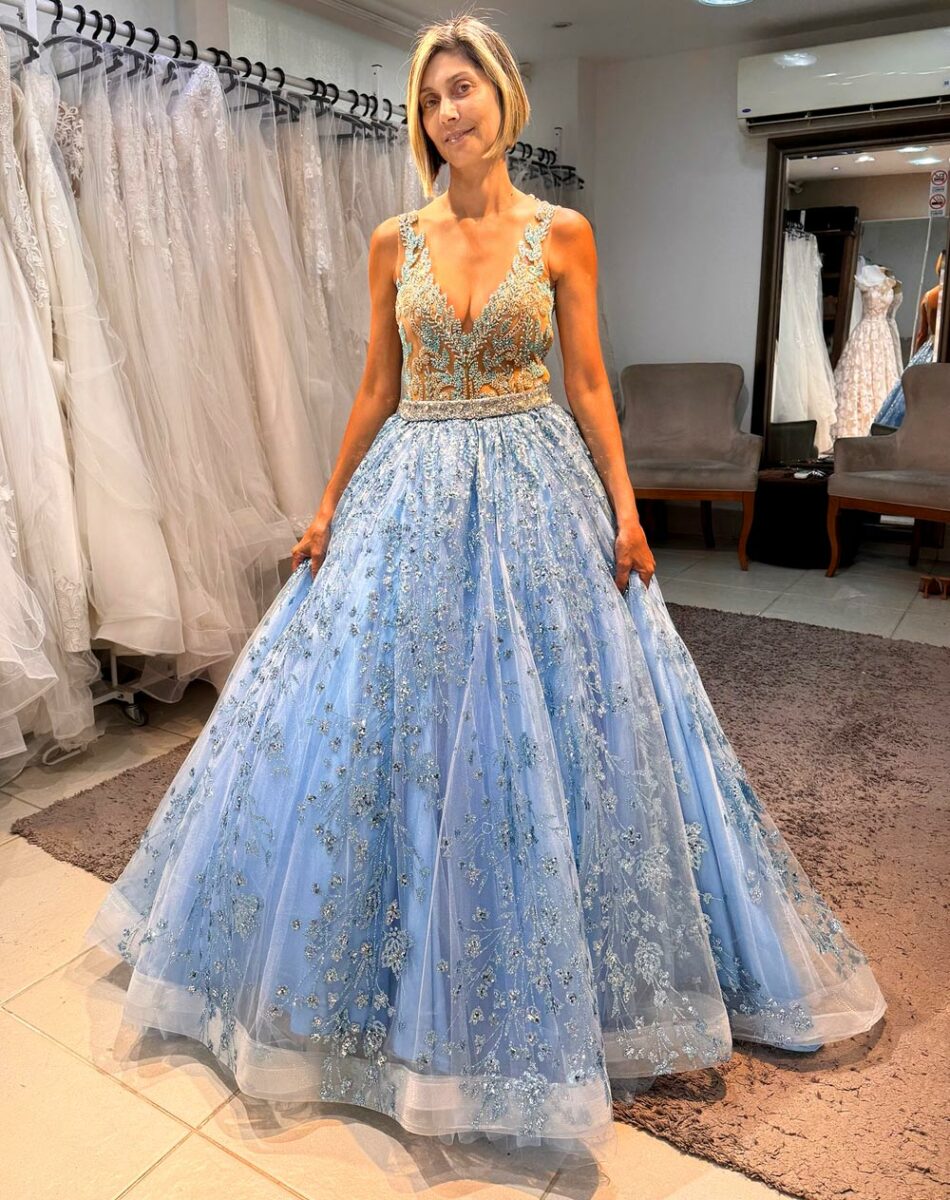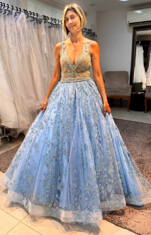 A sobreposição da saia longa em tule azul alugada separadamente transforma o modelo em um verdadeiro vestido de princesa contemporânea. Esta saia volumosa possui camadas de tule bordadas com flores em relevo, cristais e fios metalizados, conferindo uma aura de conto de fadas e brilho etéreo. O cinto bordado marca a cintura com delicadeza, criando uma transição perfeita entre o corpete ricamente ornamentado e o volume vaporoso da saia.