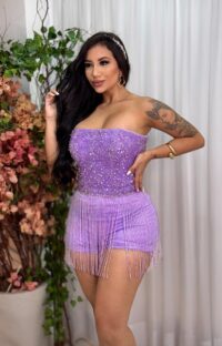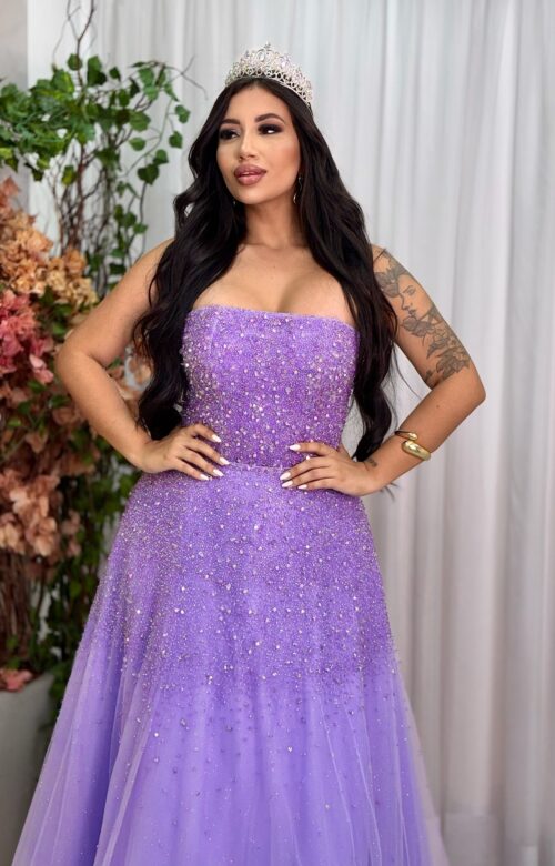 A cor lilás escolhida para este vestido é versátil e delicada, transmitindo juventude e romantismo. Esse tom harmoniza com diferentes tipos de iluminação, desde luzes suaves e naturais até iluminações artificiais mais intensas, destacando-se em qualquer ambiente e criando um efeito visual maravilhoso, especialmente em fotos e vídeos. A tonalidade lilás é perfeita para combinar com decorações de festas de 15 anos que seguem temas de princesa, realeza, ou até mesmo algo mais moderno e refinado.