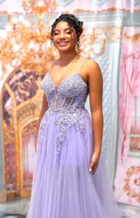 Este deslumbrante vestido de debutante na tonalidade lavanda traduz toda a delicadeza e o romantismo de uma noite inesquecível. Seu corpete estruturado apresenta decote em V profundo e alcinhas, com bojo embutido e laterais em tule ilusion, garantindo sustentação e um caimento impecável. A parte superior é artisticamente bordada à mão com aplicações florais tridimensionais, pedrarias e miçangas cintilantes, que refletem a luz de maneira suave e elegante.