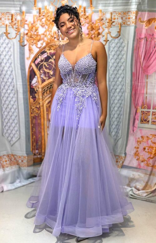 Vestido longo na cor lavanda com silhueta fluida estilo princesa, confeccionado em tule leve, corpete ilusion estruturado e alcinhas, decote em V profundo. O busto é ricamente bordado com aplicações florais, pedrarias e transparências estratégicas, criando um visual sofisticado e encantador.