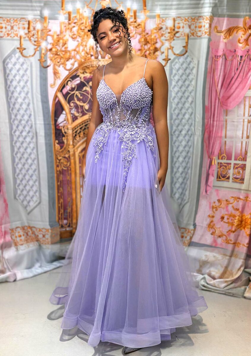 Vestido de debutante lavanda fluido decote em V com alcinhas corpete bordado em pedrarias