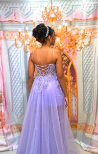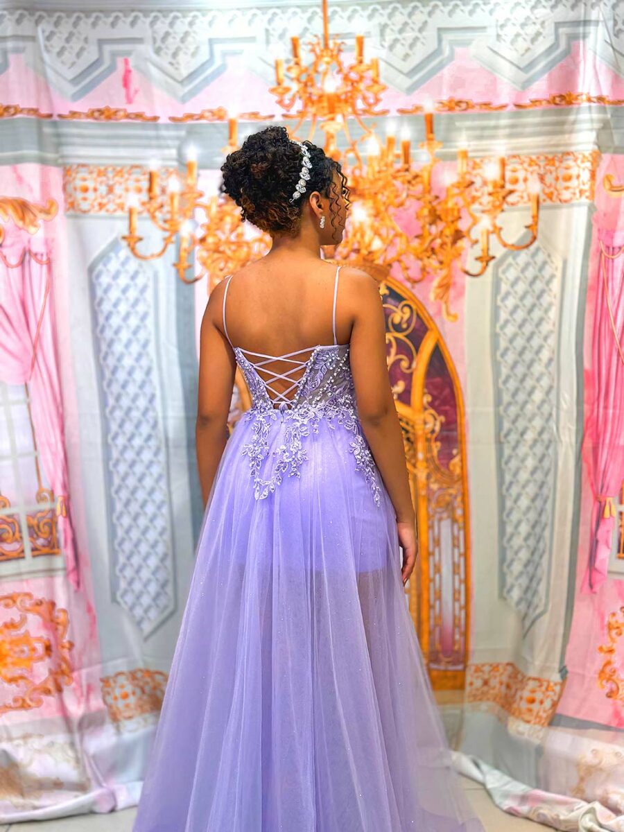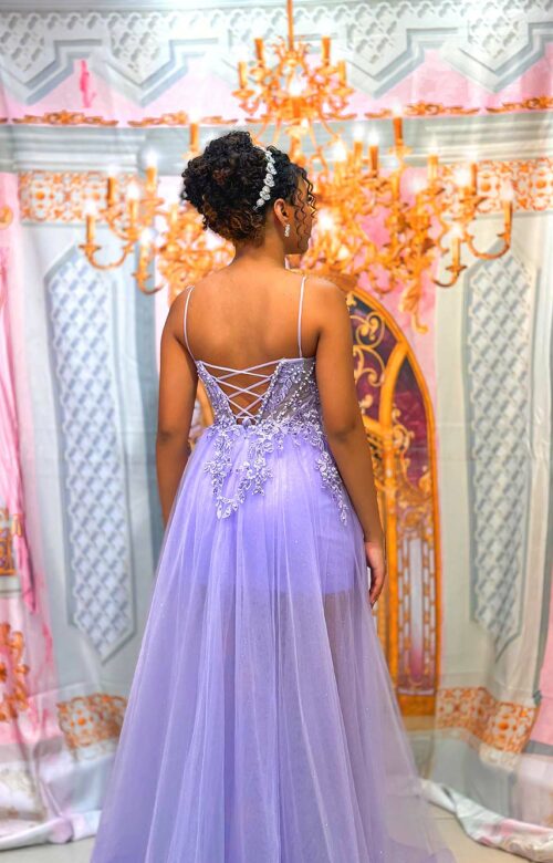 A saia ampla em camadas de tule esvoaçante confere movimento e leveza, criando o efeito de uma verdadeira princesa moderna. O caimento fluido do tule, somado à transparência leve nas sobreposições, proporciona um brilho etéreo e um visual de conto de fadas. A cor lavanda, símbolo de feminilidade e serenidade, completa o visual com um toque jovial e romântico.