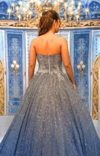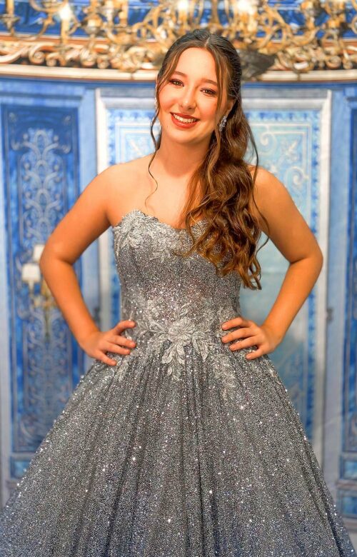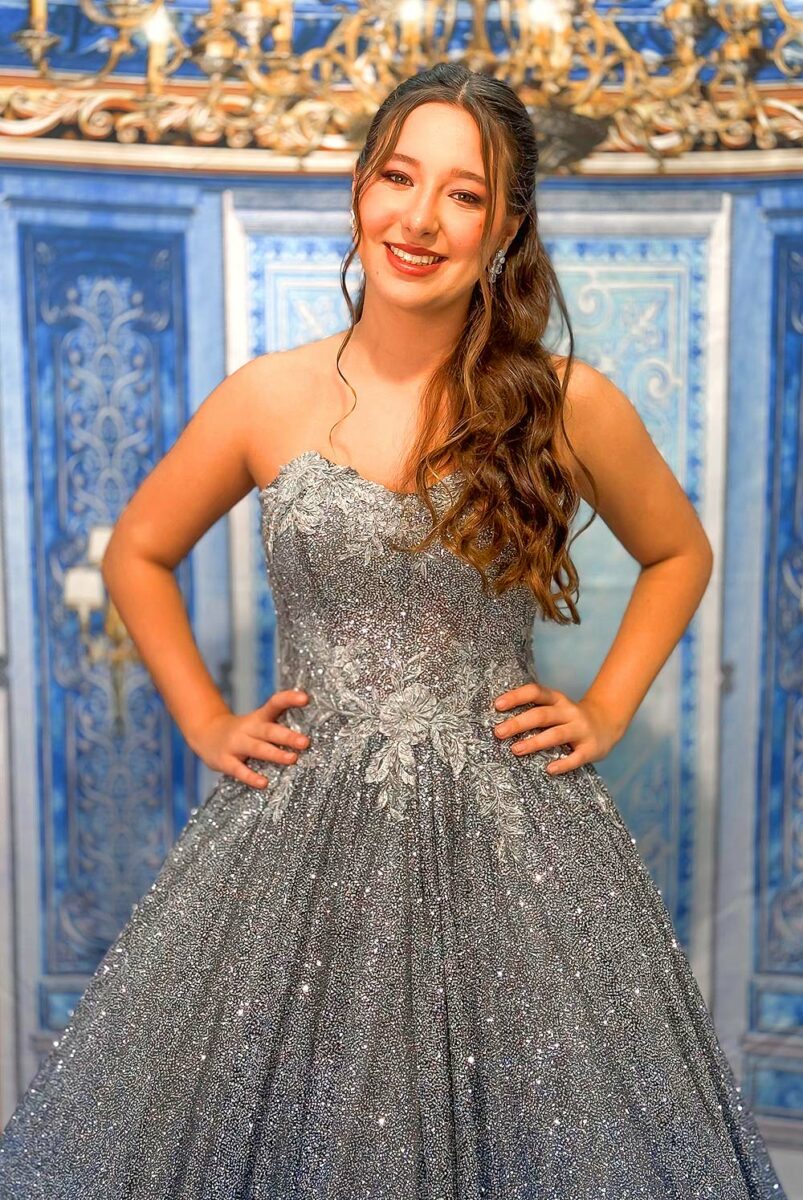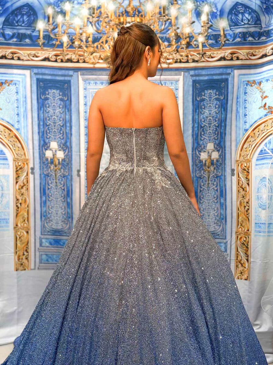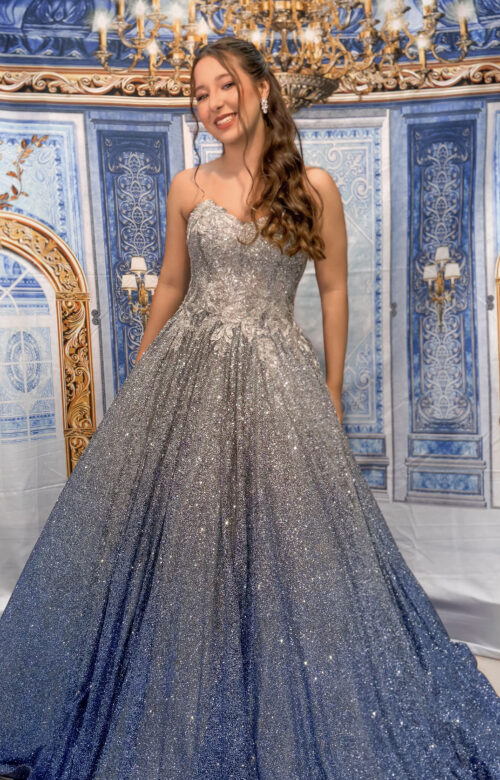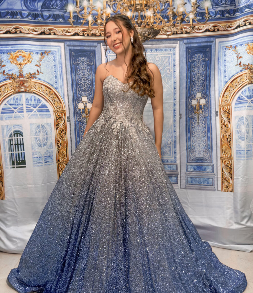 Este vestido de debutante é a definição de luxo cintilante e encanto moderno, ideal para quem deseja brilhar com elegância e presença. O modelo combina o brilho do prata sofisticado com a serenidade do azul profundo, formando um degradê harmonioso que reflete a luz de forma deslumbrante a cada movimento.