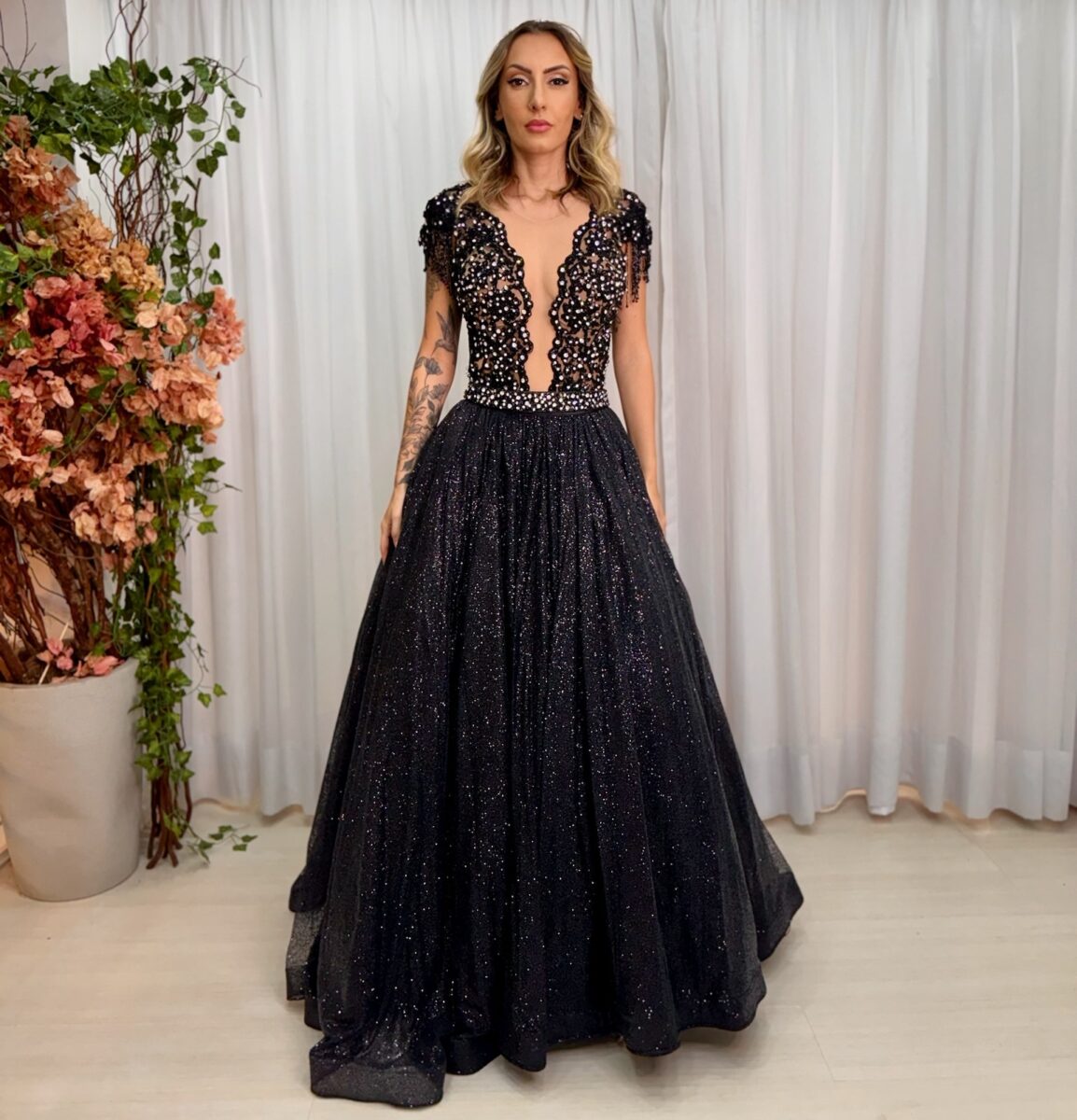 Este vestido é perfeito para quem deseja brilhar com elegância e versatilidade, mantendo o charme e a sofisticação em cada momento da celebração.