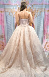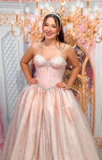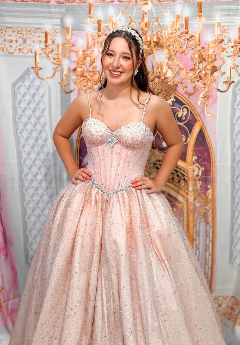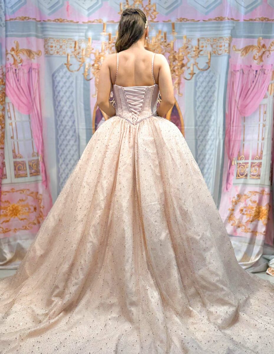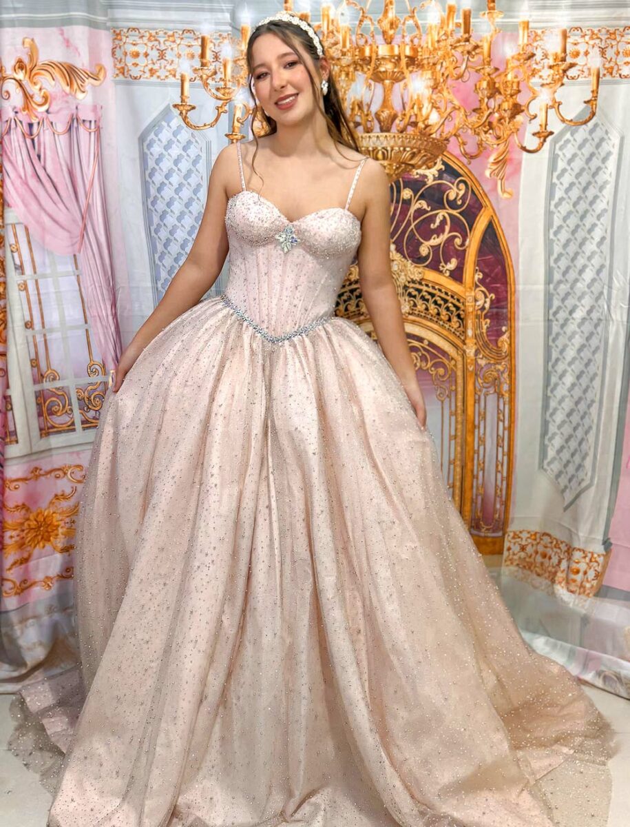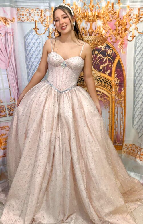 A saia ampla em camadas de tule e organza reluzente apresenta um volume exuberante que garante movimento e imponência, perfeita para a entrada triunfal ou a tradicional valsa de 15 anos. O caimento fluido e o brilho difuso do tecido evocam o encanto de um conto de fadas, enquanto a tonalidade suave do rosa champagne confere um toque atemporal e sofisticado.
