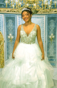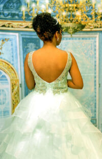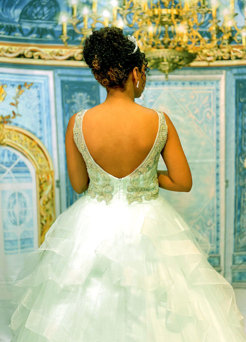 A saia volumosa em camadas de tule organza perolado é um espetáculo à parte: as sobreposições formam um caimento fluido e majestoso, conferindo leveza e movimento a cada passo. O efeito cintilante do tecido, combinado aos babados etéreos, traz uma aura de conto de fadas perfeita para o momento em que a debutante se transforma na verdadeira princesa da noite.