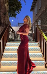 Vestido de festa em cetim italiano com blusa rebordada em pedrarias, um belo decote, saia sereia com fenda.