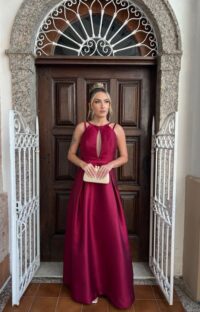 Vestido de festa marsala em zibeline de seda, decote pingo, sem manga, saia evasê.