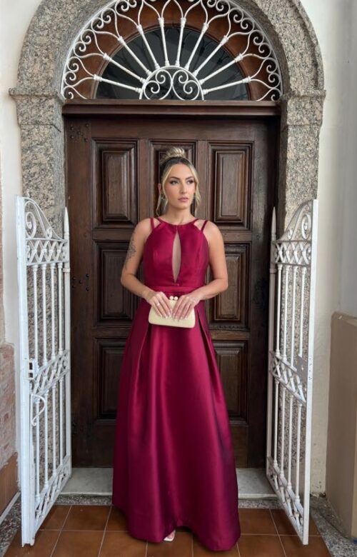 Vestido de festa marsala evasê em zibeline de seda e decote pingo.