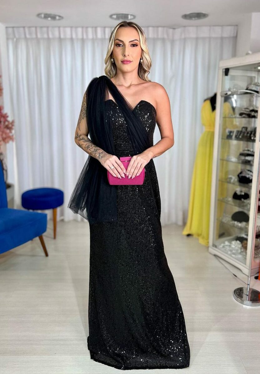 Vestido de festa preto rebordado em paetê, decote coração tomara-que-caia, faixa no ombro e saia reta.