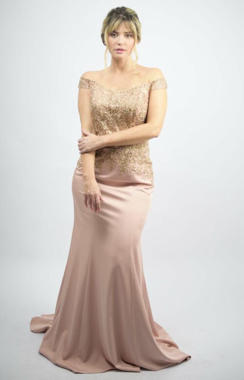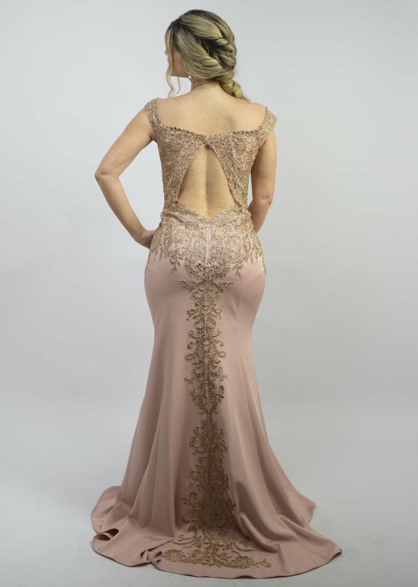 Vestido de festa rosa em crepe com renda dourada, decote ombro a ombro, mangas curtas e decote também nas costas. Saia sereia.