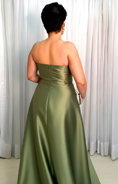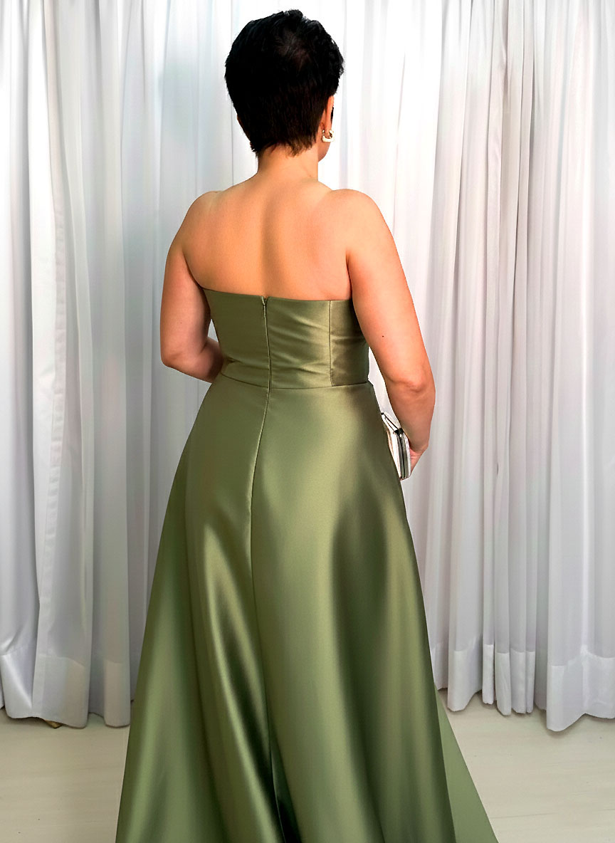 Elegante e sofisticado, este vestido de festa em tom verde oliva acetinado é a definição de charme atemporal. O decote tomara-que-caia em formato coração valoriza o colo com feminilidade e estrutura, enquanto o drapeado assimétrico sobre o busto cria um efeito escultural que destaca a parte superior do look.