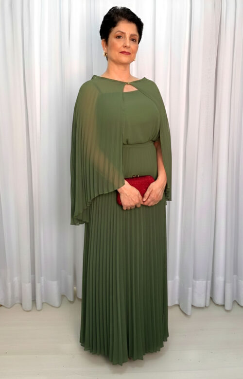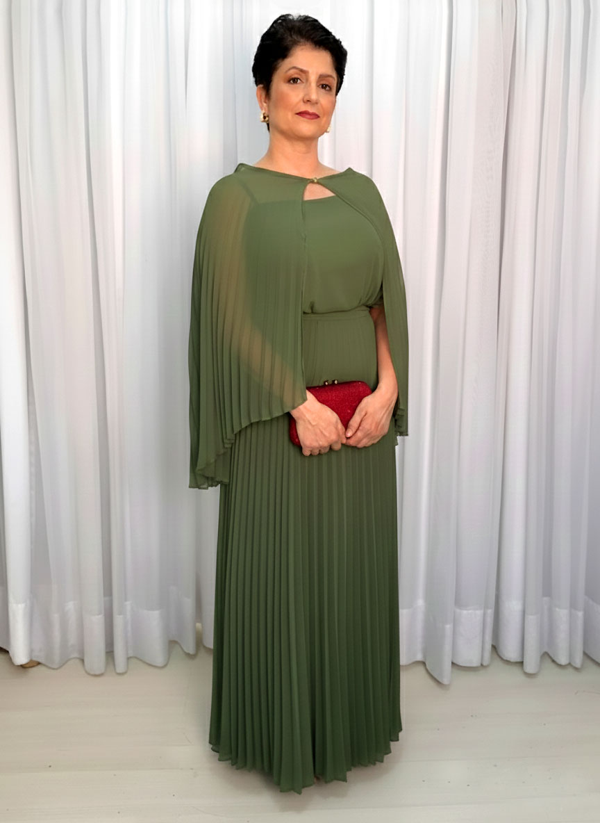 Vestido de festa longo na cor verde oliva, em tecido leve e fluido com plissado vertical. Possui silhueta longa e reta, cintura suavemente marcada e sobreposição em forma de capa removível com efeito plissado, criando movimento e elegância. Apresenta decote reto alto com alcinhas e acabamento minimalista, sofisticado e atemporal.