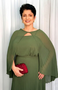 Este vestido de festa traduz elegância clássica aliada à fluidez contemporânea. Confeccionado em tecido leve de excelente caimento, o modelo apresenta um plissado vertical integral na saia, o que proporciona movimento suave, alongamento visual da silhueta e um aspecto extremamente refinado.