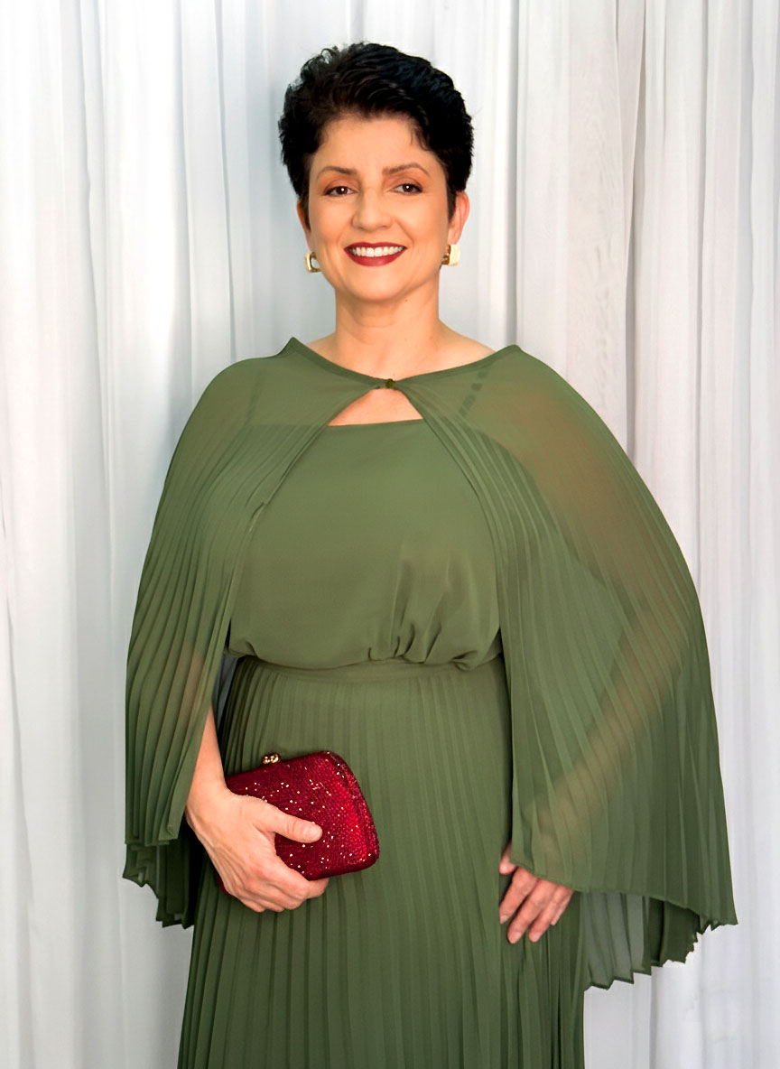 Vestido de festa verde oliva silhueta longa reta plissada com capa fluida integrada e removível decote reto com alcinhas