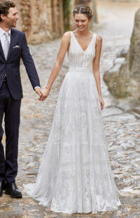 Este vestido é a expressão perfeita da elegância leve, com um toque boêmio e romântico que encanta à primeira vista. Ideal para noivas que buscam naturalidade com sofisticação, ele une a fluidez dos tecidos com um trabalho refinado de renda e textura.