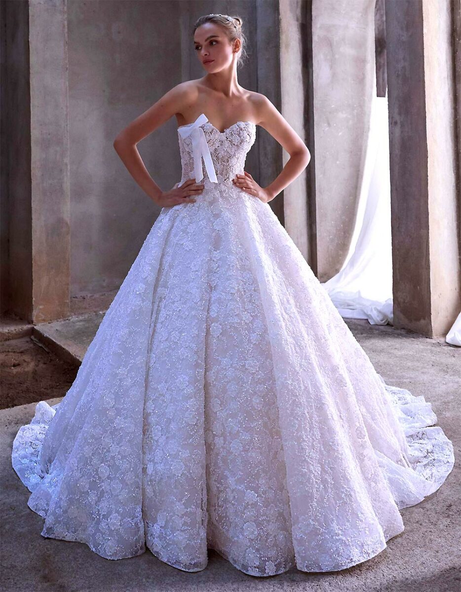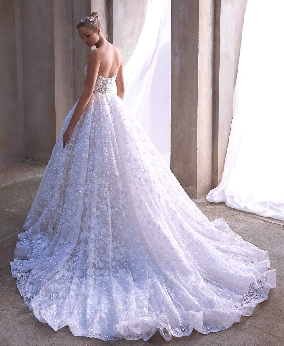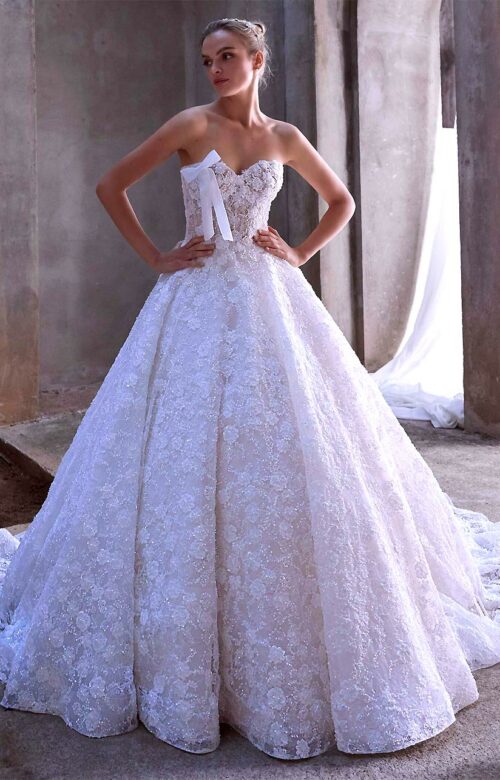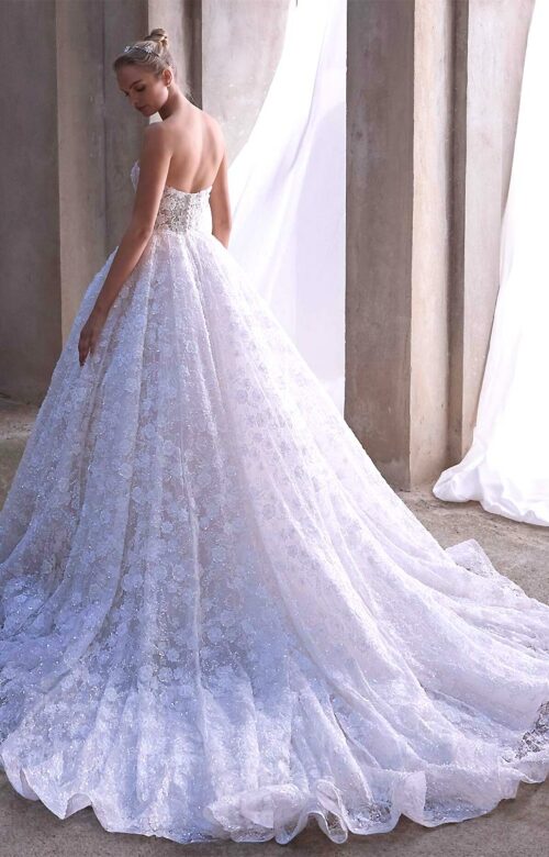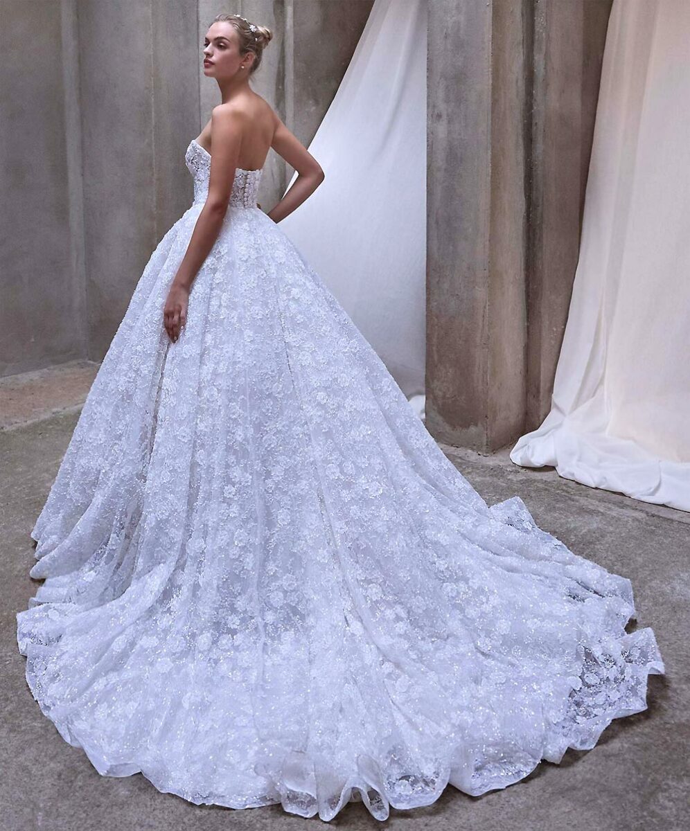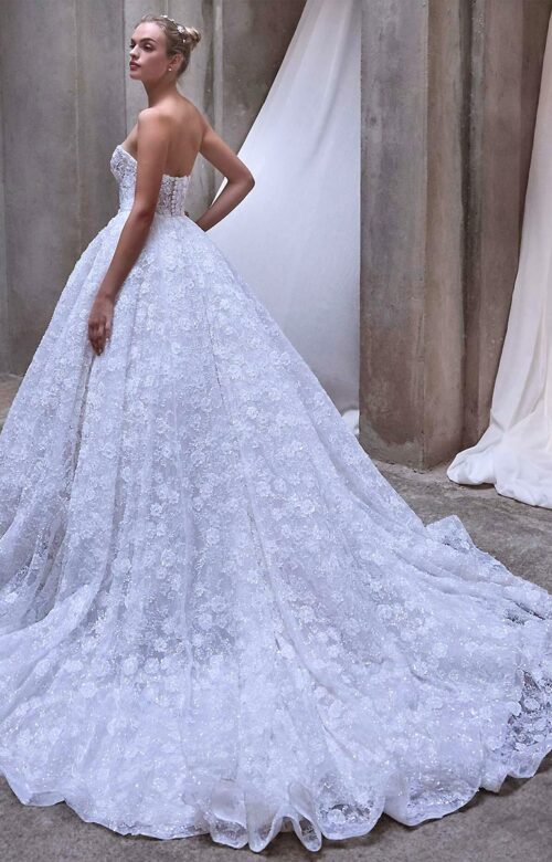 A saia ampla é inteiramente confeccionada em renda bordada, com aplicações em relevo que criam profundidade, textura e brilho sutil ao longo de toda a peça. A cauda longa acrescenta dramaticidade e sofisticação ao caminhar, tornando o vestido ideal para cerimônias formais e entradas impactantes. O acabamento refinado garante um visual luxuoso tanto na frente quanto nas costas.