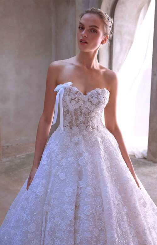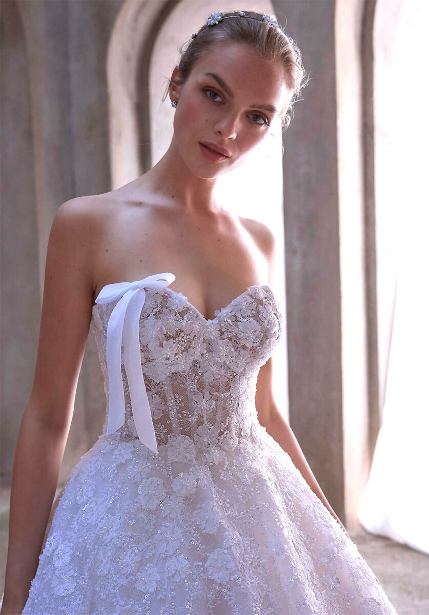 Este vestido de noiva apresenta uma estética clássica e imponente, ideal para noivas que desejam um visual marcante e atemporal. A silhueta princesa valoriza a cintura e cria um caimento volumoso e fluido, proporcionando elegância e presença. O decote tomara que caia em formato coração realça o colo de forma delicada, enquanto o corpete estruturado oferece sustentação e definição ao busto.