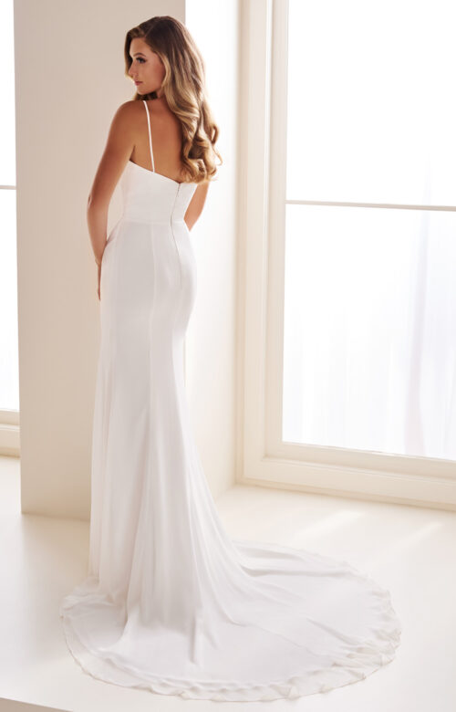 Este vestido de noiva é uma ode à elegância minimalista. Confeccionado em musseline de seda fluido, o modelo valoriza a silhueta feminina com um caimento suave e natural, conferindo leveza e movimento a cada passo. Seu decote levemente drapeado estilo cowl confere um toque romântico e contemporâneo, enquanto as alças finas trazem delicadeza e feminilidade.