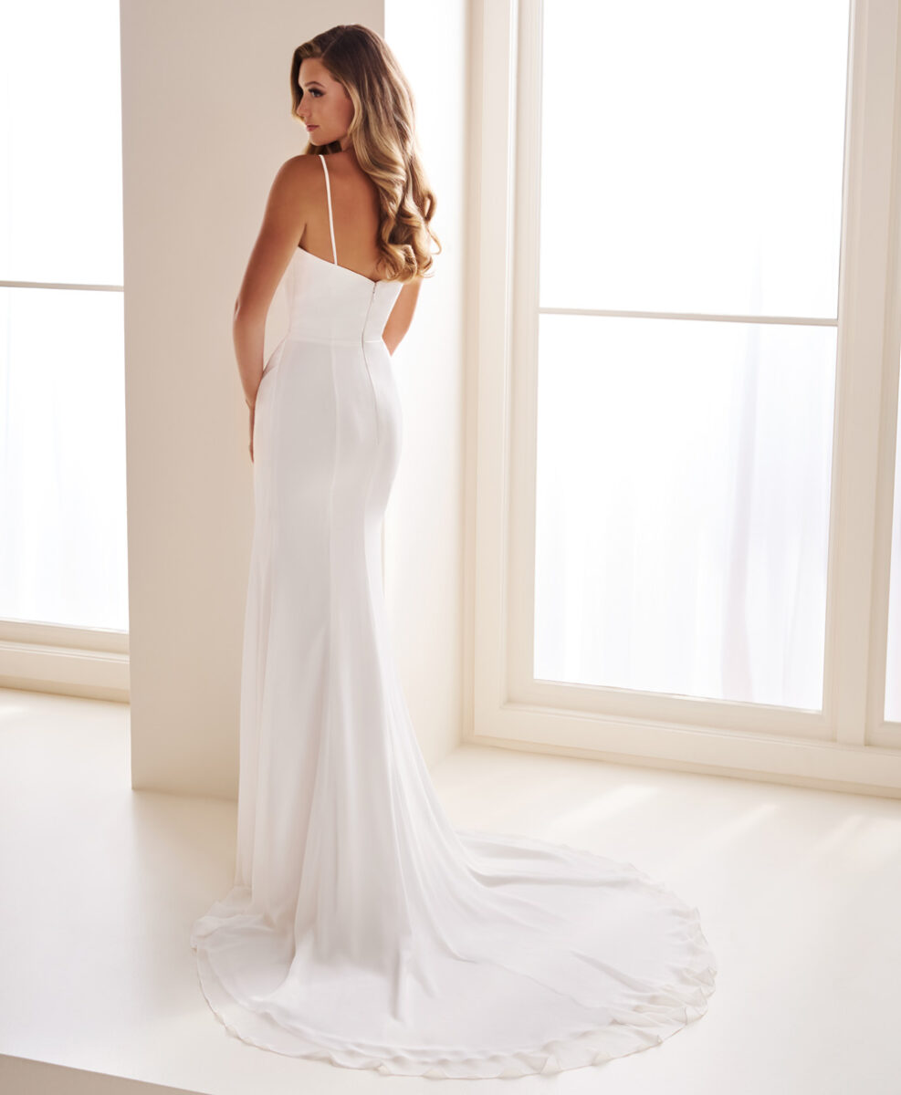 Este vestido de noiva é uma ode à elegância minimalista. Confeccionado em musseline de seda fluido, o modelo valoriza a silhueta feminina com um caimento suave e natural, conferindo leveza e movimento a cada passo. Seu decote levemente drapeado estilo cowl confere um toque romântico e contemporâneo, enquanto as alças finas trazem delicadeza e feminilidade.