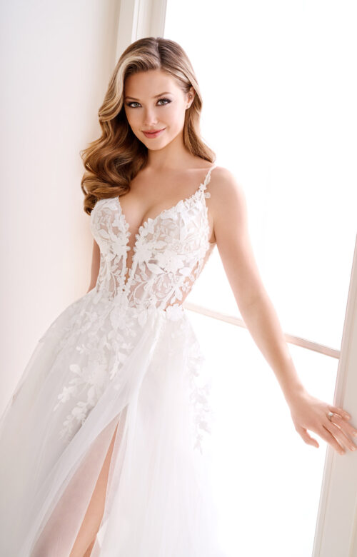 Este vestido de noiva combina elegância e modernidade em um design que exala feminilidade e leveza. O modelo apresenta um corpete estruturado em renda floral aplicada sobre tule ilusion transparente, criando um efeito de segunda pele com transparências sutis e um decote em V profundo que valoriza o colo de forma refinada. As alças finas bordadas com flores tridimensionais complementam a delicadeza do busto e conduzem o olhar a uma costas baixas em tule ilusion, que proporcionam sensualidade na medida certa.