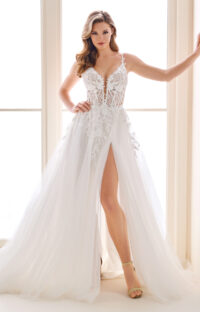 A saia em camadas de tule leve flui com suavidade, criando movimento e um ar etéreo a cada passo da noiva. A fenda frontal adiciona um toque contemporâneo e ousado, revelando as pernas com elegância, enquanto a cauda média e fluida completa o visual com um caimento romântico e natural.