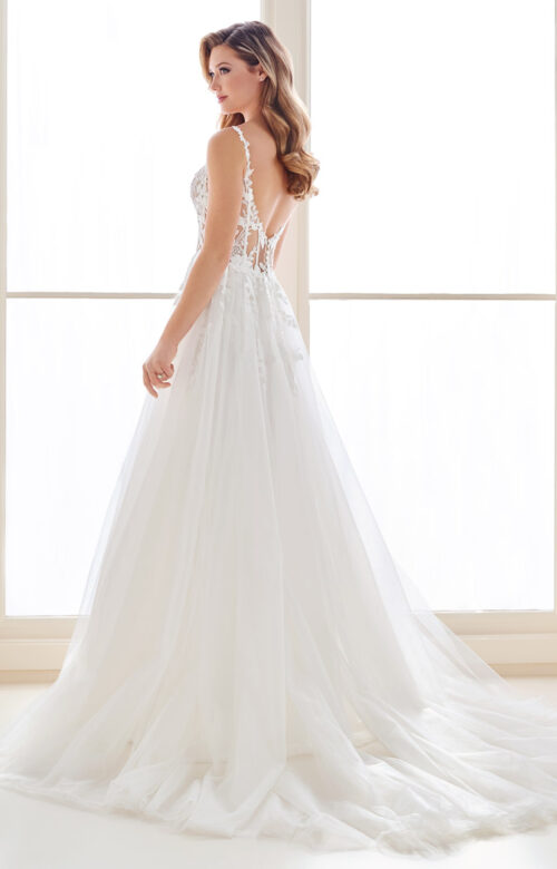 Vestido de noiva em tom off white com silhueta princesa fluido. Possui corpete ilusion estruturado com decote em V profundo e transparências sutis, alças finas com aplicações florais, e saia fluida em camadas de tule suave com fenda frontal e cauda delicada. Fechamento posterior com zíper invisível e ajuste anatômico ao corpo.