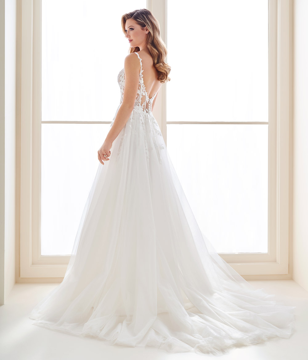 Este vestido de noiva combina elegância e modernidade em um design que exala feminilidade e leveza. O modelo apresenta um corpete estruturado em renda floral aplicada sobre tule ilusion transparente, criando um efeito de segunda pele com transparências sutis e um decote em V profundo que valoriza o colo de forma refinada. As alças finas bordadas com flores tridimensionais complementam a delicadeza do busto e conduzem o olhar a uma costas baixas em tule ilusion, que proporcionam sensualidade na medida certa.
