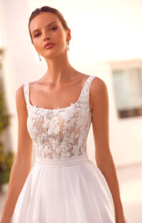 Este vestido traduz a elegância atemporal em uma proposta romântica e refinada. A parte superior em tule transparente delicadamente bordado com flores em relevo cria um efeito etéreo e sofisticado, revelando sutilmente a silhueta com leve transparência. O decote quadrado e as alças médias trazem equilíbrio e sustentação, enquanto o decote em “U quadrado” nas costas adiciona um toque de sensualidade discreta.