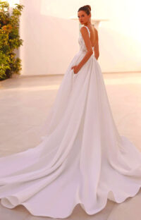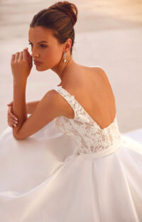 A cintura é realçada por um cinto de cetim fino que harmoniza a transição para a volumosa saia em mikado de zibeline, um tecido nobre de textura encorpada e caimento impecável. A saia se abre em ampla fluidez, terminando em uma cauda longa e ondulada que confere imponência e movimento ao caminhar.