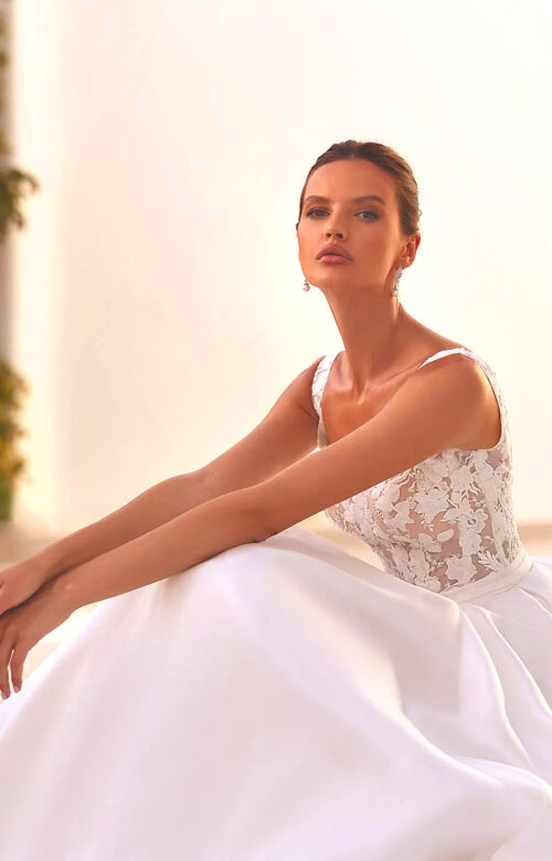 Vestido de noiva offwhite em modelagem godê com saia ampla em mikado de zibeline. O corpet apresenta base translúcida em tule ilusion com aplicações florais bordadas e decote quadrado com alças médias. Costas em decote “U quadrado” profundo, cinto acetinado marcando a cintura e cauda longa fluida.