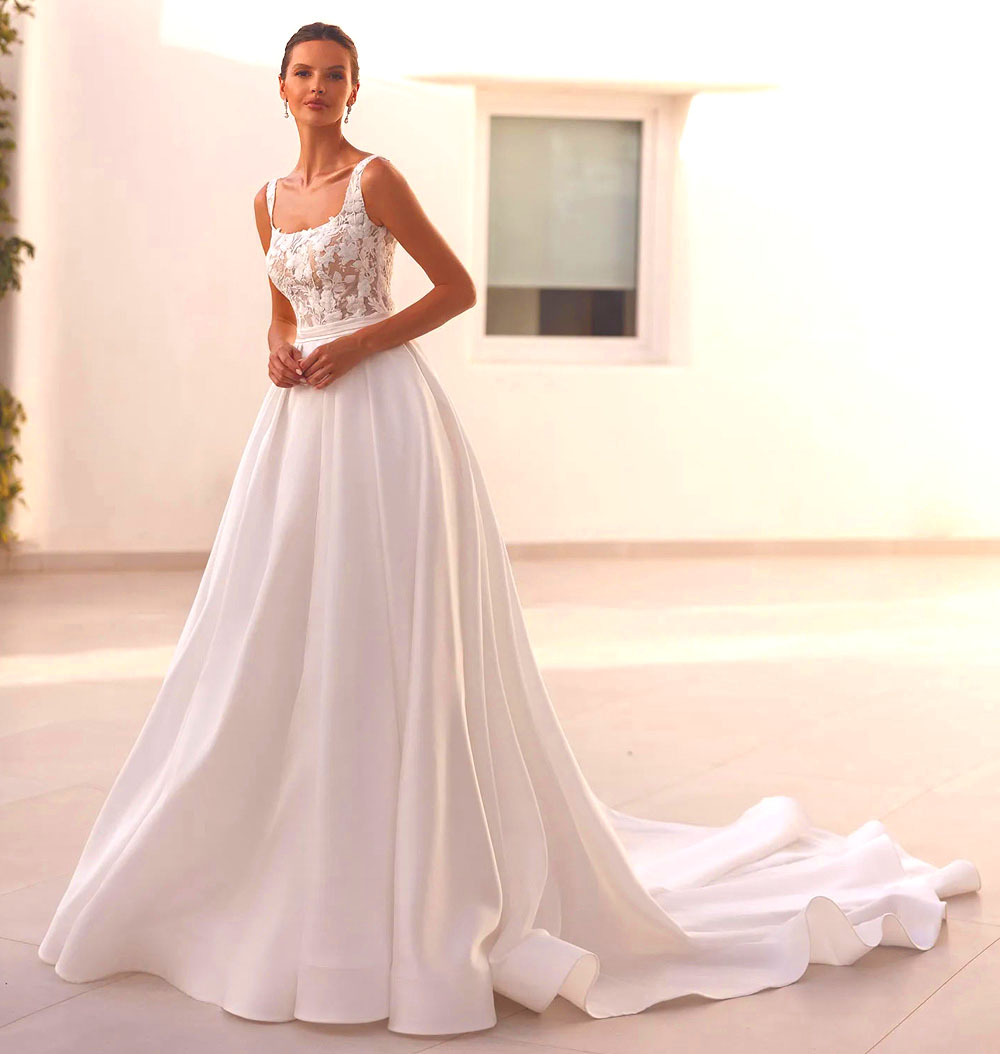 Este vestido traduz a elegância atemporal em uma proposta romântica e refinada. A parte superior em tule transparente delicadamente bordado com flores em relevo cria um efeito etéreo e sofisticado, revelando sutilmente a silhueta com leve transparência. O decote quadrado e as alças médias trazem equilíbrio e sustentação, enquanto o decote em “U quadrado” nas costas adiciona um toque de sensualidade discreta.