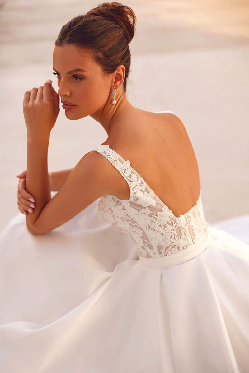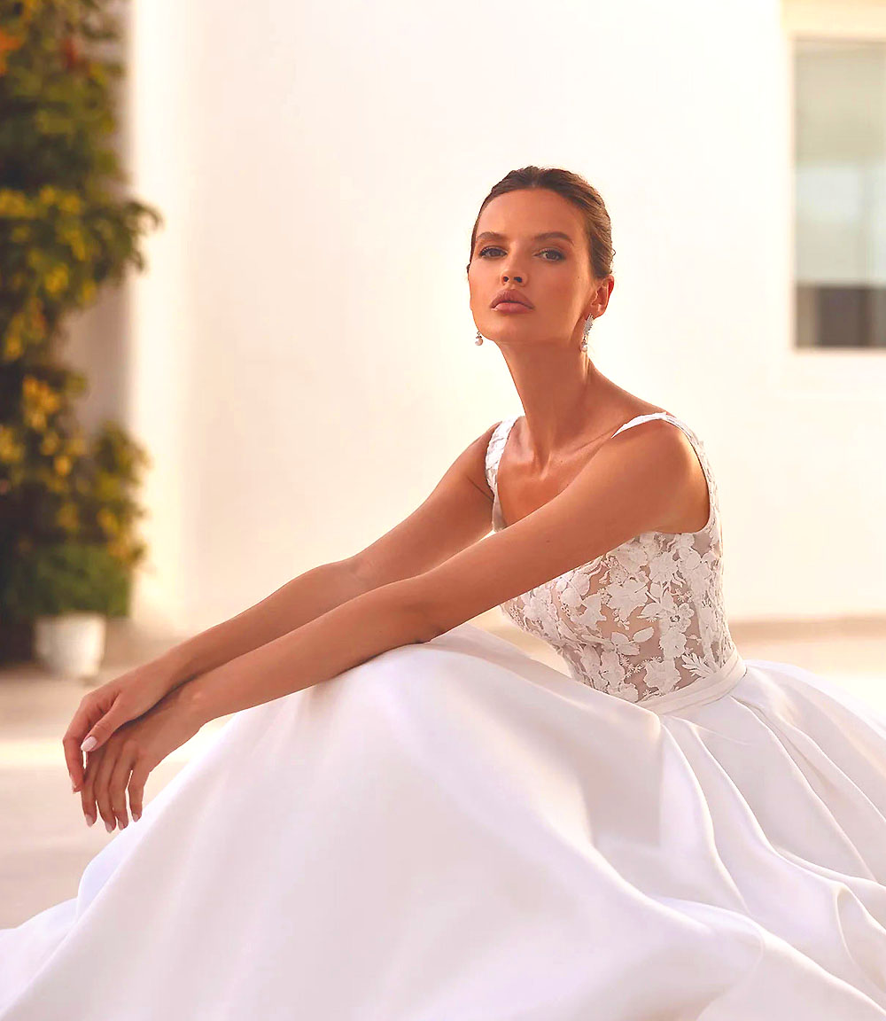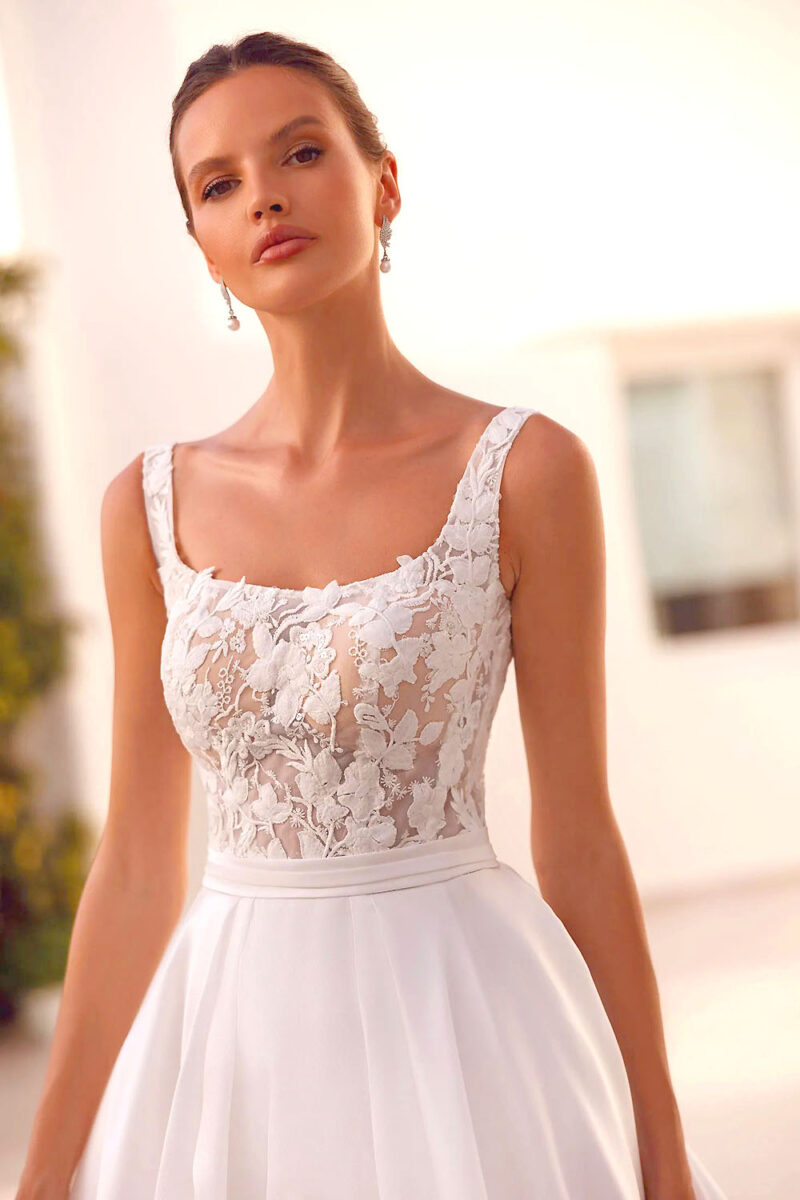 Vestido de noiva offwhite em modelagem godê com saia ampla em mikado de zibeline. O corpet apresenta base translúcida em tule ilusion com aplicações florais bordadas e decote quadrado com alças médias. Costas em decote “U quadrado” profundo, cinto acetinado marcando a cintura e cauda longa fluida.