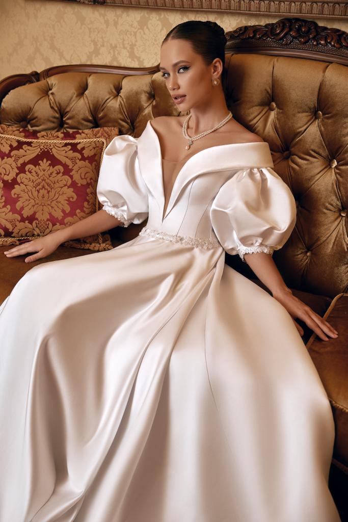 Modelo 2 em 1 com mangas removíveis. Elegantemente sofisticado e minimalista com Decote ombro a ombro e profunda fenda equilibrando o volume da manga bufante. Corpete e cinto bordados manualmente.