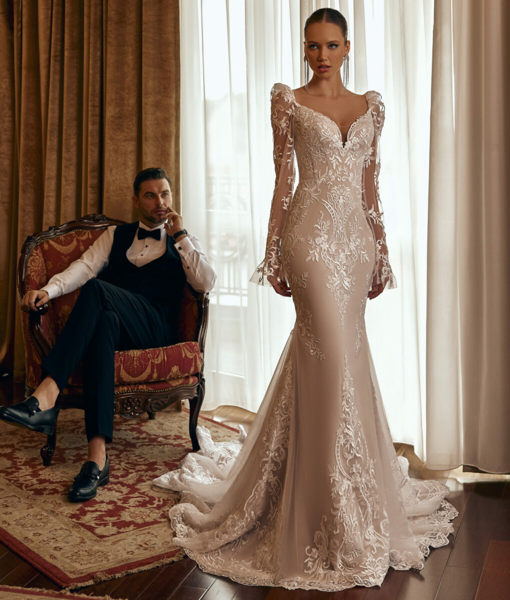 Este modelo une exuberância e sensualidade. Os detalhes românticos resultam na harmonia perfeita da doce paixão com rendas bordadas manualmente que destacam-se de forma única o seu fundo cappuccino light e tornam-se mais delicadas quando aplicadas ao tule transparente da manga longa bufante.