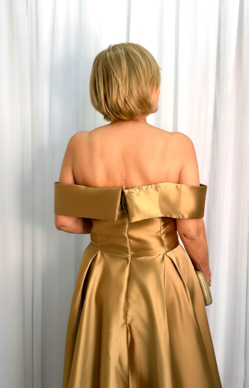 Vestido de festa longo e volumoso em tecido estruturado e acetinado, na cor dourado ouro velho. A silhueta é evasê com volume, caracterizada pelo corpete ajustado com decote tomara que caia reto. O design inclui uma faixa de tecido dobrada que simula um decote ombro a ombro. O busto e a cintura são ricamente trabalhados com bordados em fio e pedrarias douradas. A saia é ampla, com pregas laterais estruturadas, garantindo volume de princesa.