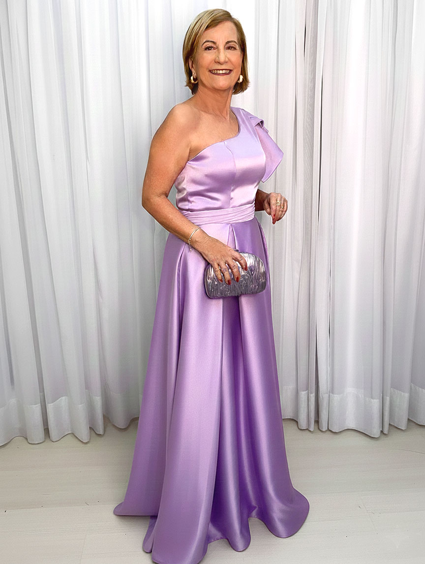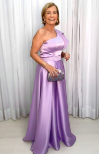 Vestido longo na cor lavanda, confeccionado em cetim italiano, com silhueta evasê. Possui decote assimétrico de um ombro só com babados, corpo estruturado, faixa na cintura do próprio tecido e saia ampla com caimento fluido. Fechamento posterior com zíper invisível e acabamento refinado.