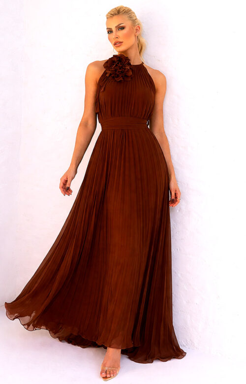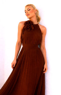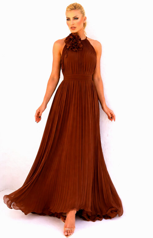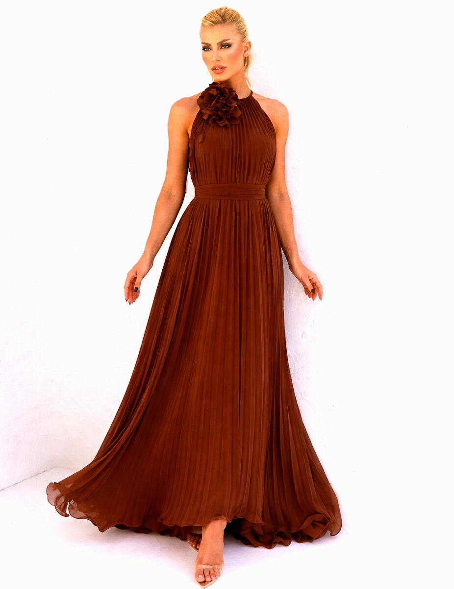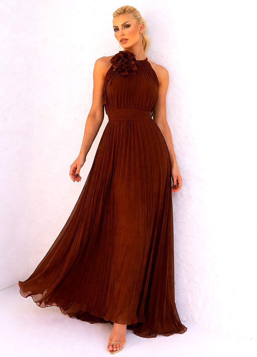 Vestido longo na cor marrom com silhueta evasê e todo plissado. Possui decote halter neck estilo gola americana, cintura marcada e aplicação floral tridimensional na altura do ombro. Confeccionado em tecido musseline leve com caimento fluido e acabamento delicado.