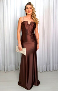 Este sofisticado vestido de gala é uma escolha atemporal para eventos formais. Confeccionado em um tecido de cetim encorpado, oferece um brilho luxuoso e uma cor Marrom Chocolate intensa e profunda, que se adapta perfeitamente a celebrações noturnas.