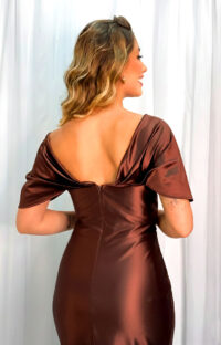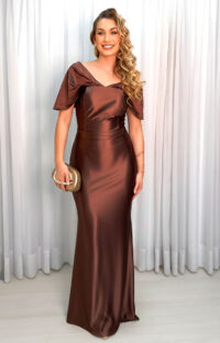 Vestido longo de festa em cetim prada acetinado de alto brilho (seda ou cetim duchese), na cor marrom chocolate. A silhueta é ajustada do busto até o quadril, abrindo em formato sereia a partir do joelho. Possui um decote ombro a ombro estruturado com mangas curtas caídas e drapeado frontal em “V”, que se estende para as costas em um decote profundo em “V” (cowl back). O fechamento é feito por zíper invisível central nas costas.