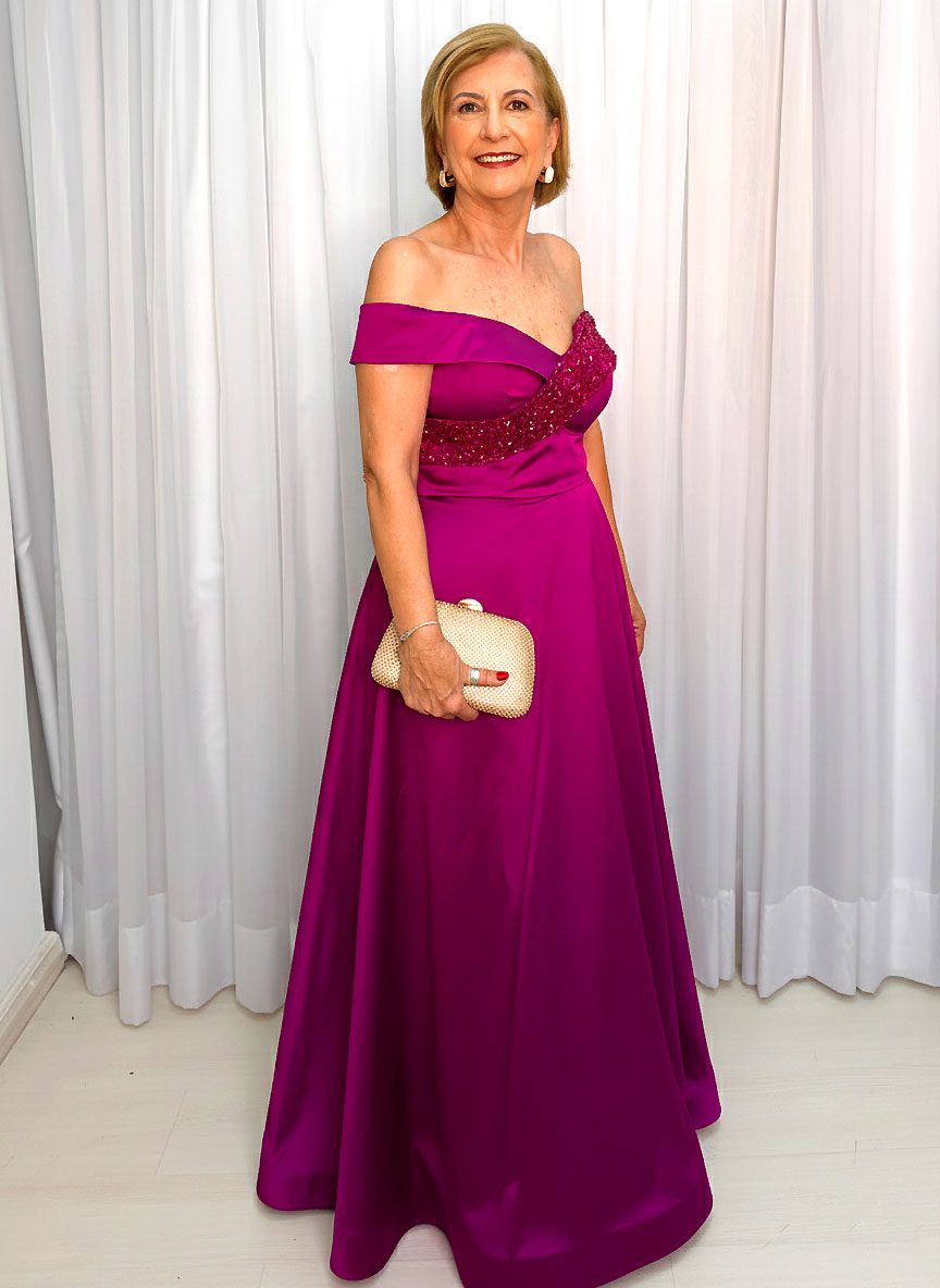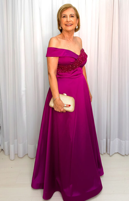 Vestido longo em tom pink/fúcsia, confeccionado em tafeta de seda acetinado de alto caimento, com decote ombro a ombro e aplicação de bordado em pedrarias no busto. Modelagem godê com saia ampla, fluida e sofisticada.