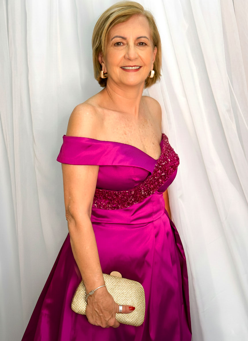 O decote ombro a ombro, elegante e feminino, valoriza o colo e os ombros com delicadeza, trazendo um charme clássico e, ao mesmo tempo, atual. O grande destaque fica por conta do bordado em pedrarias e cristais aplicado no busto, que cria um ponto de luz luxuoso e refinado, elevando o nível de sofisticação da peça.