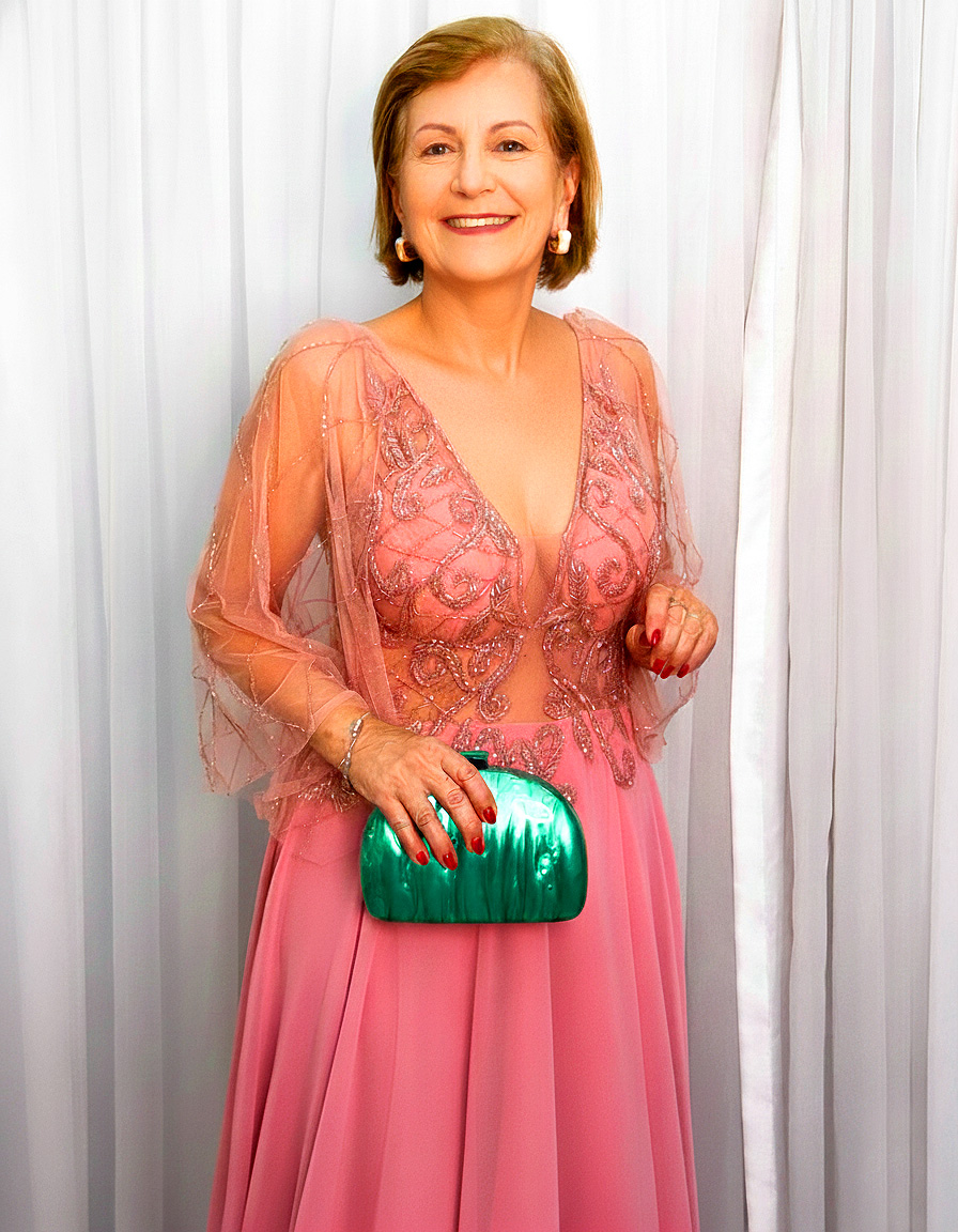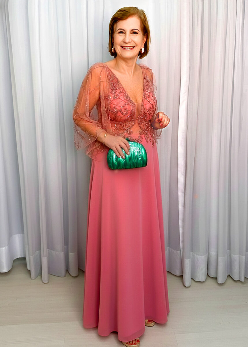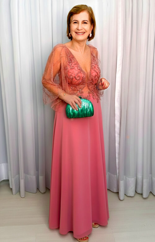 O decote V profundo na frente alonga visualmente o colo, enquanto o decote posterior em V adiciona sensualidade na medida certa. As mangas em tule bordado, levemente transparentes e soltas, conferem charme etéreo ao modelo, além de suavizar a região dos braços. A saia longa em crepe de seda garante movimento elegante e acabamento impecável, ideal para eventos formais.