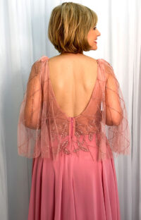 Vestido longo em tom rosé, confeccionado em crepe de seda fluido, com silhueta evasê. Corpete estruturado com bordados elaborados em fios e pedrarias, decote V profundo frontal e posterior, mangas curtas amplas em tule bordado translúcido e fechamento posterior por zíper invisível.