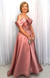 Vestido longo na cor rosê, confeccionado em zibeline estruturado, com silhueta A e decote ombro a ombro formado por pala larga estruturada. Apresenta corpo ricamente bordado, saia ampla de caimento encorpado, acabamento sofisticado e visual clássico. Modelo elegante e atemporal, ideal para eventos formais.
