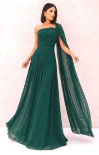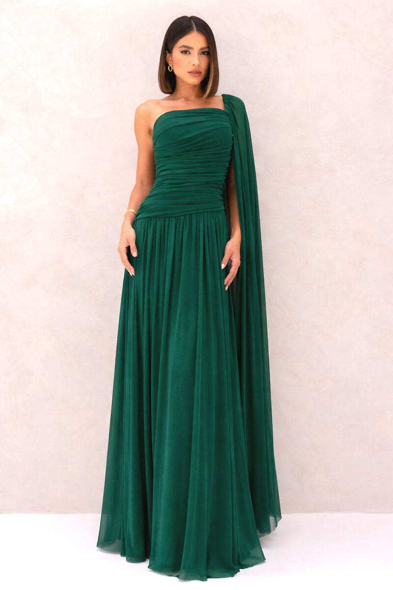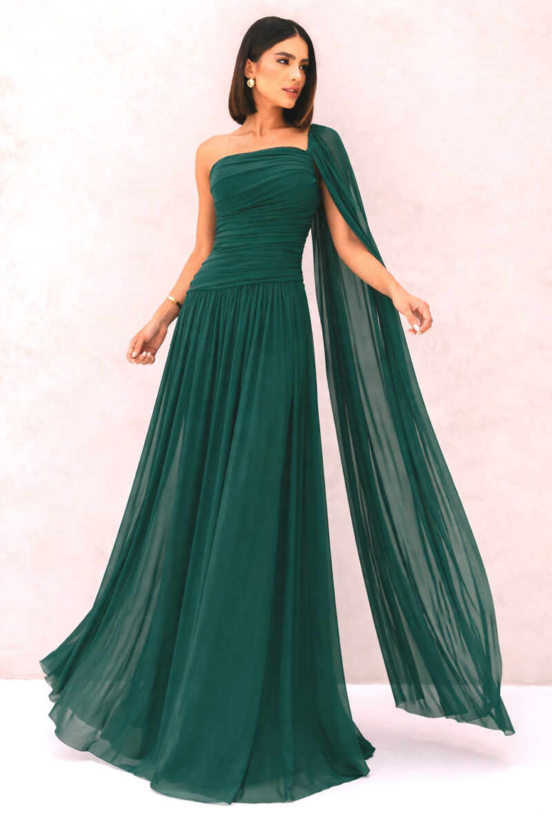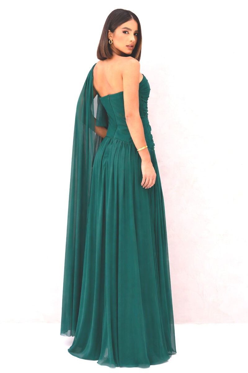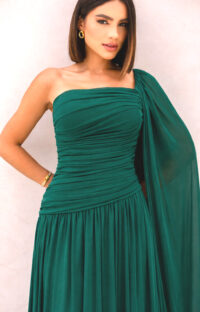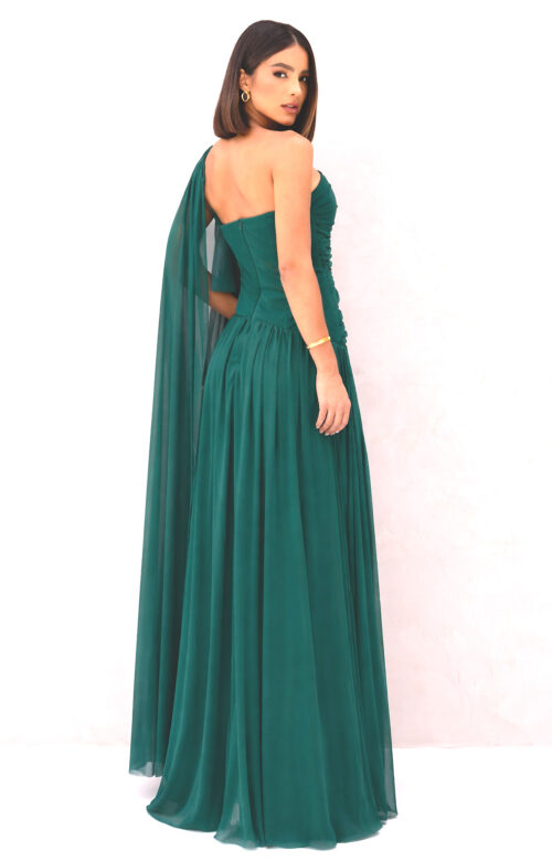 Vestido longo em na cor verde esmeralda, com silhueta evasê e caimento leve. Possui decote ombro único com drapeado estruturado no busto e torso, além de manga fluida em tule que cria efeito de capa. Modelo elegante com acabamento refinado.